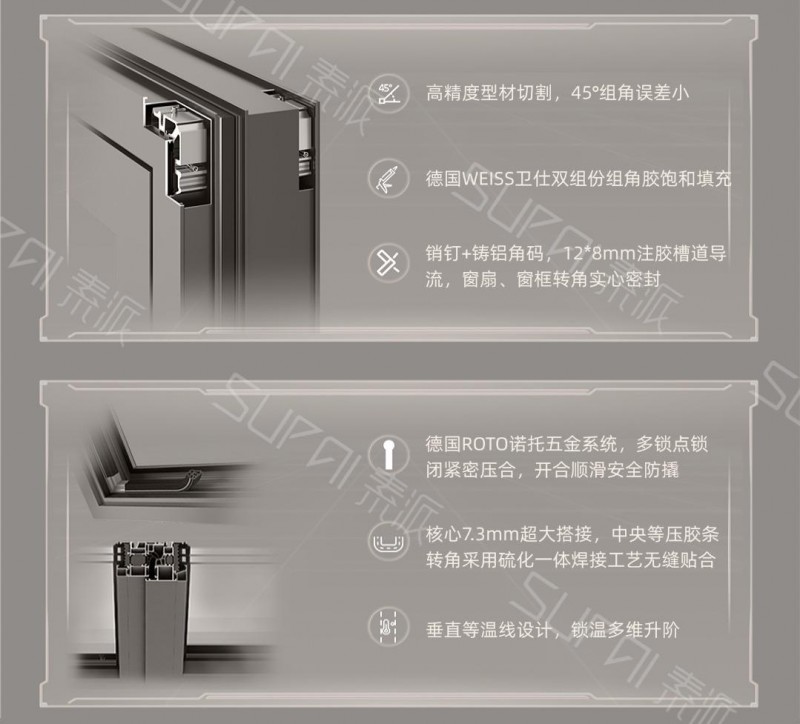 素派门窗型材角部拼接采用铸铝角码+销钉链接+双组份组角胶注胶工艺,大幅提高角部强度,确保角部密封性能与结构稳固;截面采用垂直等温线设计,多腔体隔热条搭配多道密封设计,层层阻隔热量交换与水汽入侵;中央等压胶条采用一体硫化焊接工艺,90°转角无缝贴合型材,确保整体密封性卓越,形成牢固的“锁温防线”,将滚滚热浪与潮湿空气坚决阻挡在外。